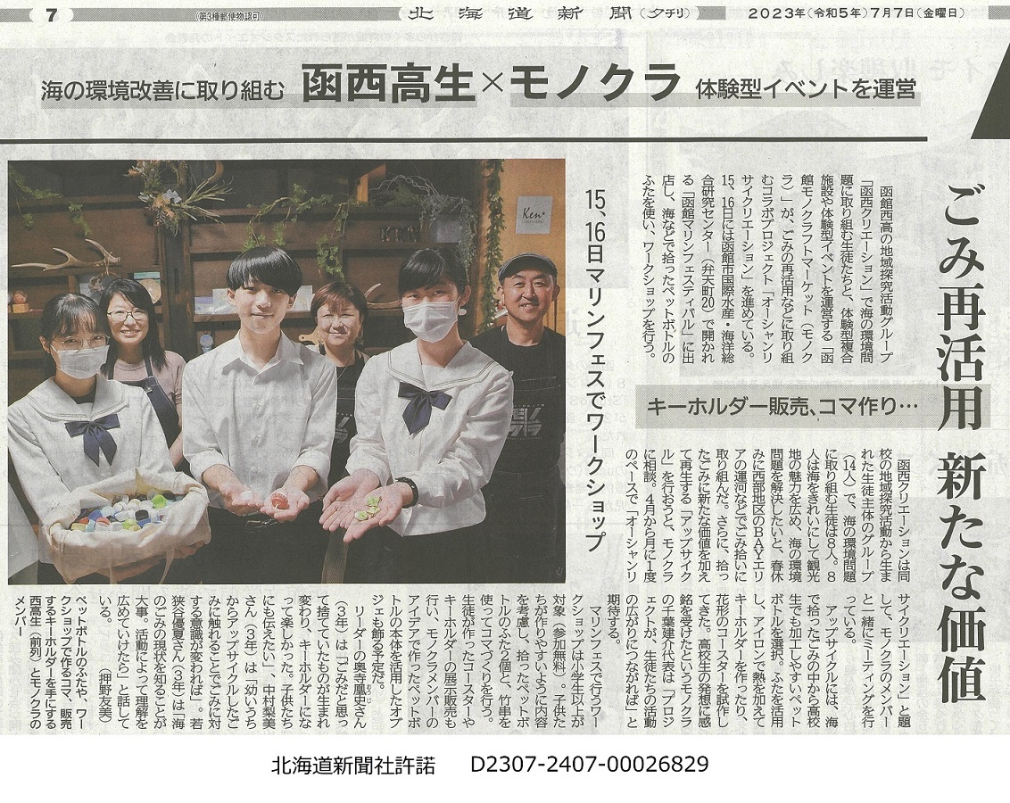 本校の地域探究活動グループ「函西クリエーション」の海の環境問題に取り組むチームが、函館モノクラフトマーケットとコラボした、ごみの再活用プロジェクトが北海道新聞7月7日夕刊に掲載されましたので紹介します。なお、北海道新聞社の許諾を得て掲載しております。