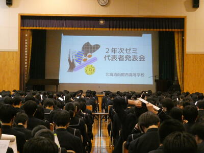 2年次探求ゼミ代表者発表会が2月26日に、本校体育館で行われました。各ゼミの代表発表は、次のとおりです。(発表順)
